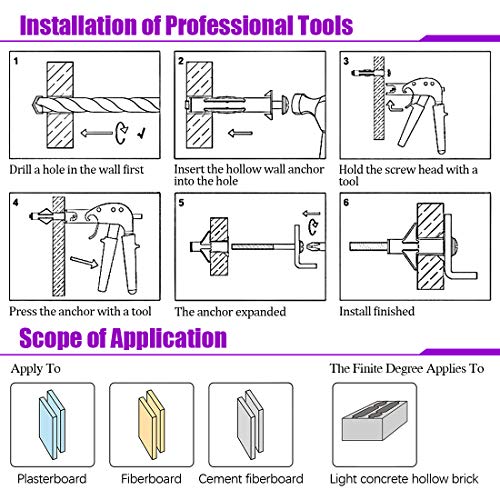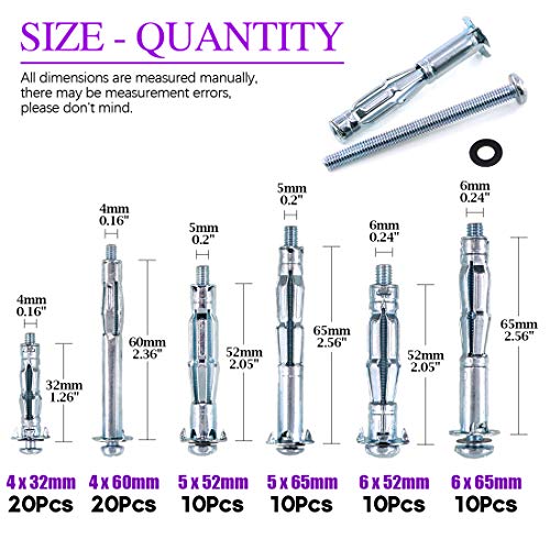 🌼 WHAT YOU GET: We have prepared 6 sizes of Molly Bolt for you to meet different needs in your daily life, including M4×32: 20Pcs, M4×60: 20Pcs, M5×52: 10Pcs, M5×65: 10Pcs, M6×52: 10Pcs, M6×65: 10Pcs. High Quality can be used for a long time. You can choose the size you need. High Quality can be used for a long time.