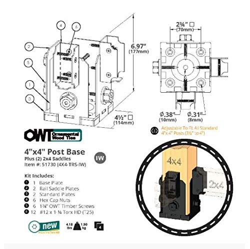 Kit Includes: 1 Base Plate, 2 Rail Saddle Plates, 2 Standard Plates, 6 Hex Cap Nuts, (6) 1-3/4-inch OWT Timber Screws, (12) #12 x 1-1/4 Torx HD (T25)